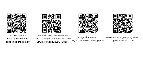 Подготовка бэклога показана на моей рисовке схемы отдельным процессом, хотя часто ее помечают просто надписью на содержании спринта. Этот процесс требует организации. Простой способ – добавить к скрам-доске три колонки слева, в первую из которых Product Owner будет вывешивать задачи, ожидающие подготовки, во второй – те, которые готовятся на данный момент и в третьей – готовые к включению в будущий спринт. Но если процесс более сложен и требует внешних согласований, то такой способ может оказаться недостаточен. Тогда для подготовки бэклога можно организовать отдельный Kanban-процесс – об этом есть хороший доклад Алексея Пименова на SECR-2016 «Discovery Kanban для управления беклогом Scrum-команды».