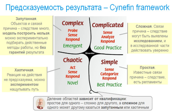 Если с компетентностью собственных сотрудников более-менее понятно, то со вторым способом могут быть проблемы. Компания решила начать новую деятельность или сделать проект – как узнать, есть ли в индустрии способы ее успешной организации? Помимо поиска информации об аналогичных проектов есть обобщенный способ получения ответа на этот вопрос – Кеневин-фреймворк (Cynefin framework) из теории сложности.