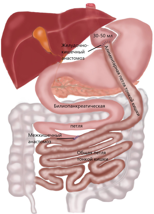 Это обеспечивается путем формирования так называемого малого желудка (в англоязычной литературе его называют pouch – мешочек, карман, сумка), который вмещает примерно в десять раз меньше еды, что ведет к значительному уменьшению порции употребляемой пищи. Ограничение дальнейшего ее усвоения достигается путем соединения малого желудка с конечным отделом тощей кишки, миновав примерно 100—270 см пищеварительного тракта. При этом так называемый большой желудок и начальный отдел тонкой кишки не удаляются, но остаются выключенными из пищеварения. Пищеварительные ферменты, содержащиеся в соках желудка, поджелудочной железы и желчи, следуя прежним путем, поступают по исключенной из участия в усвоении пищи части тощей кишки и контактируют с едой уже практически в подвздошной кишке.