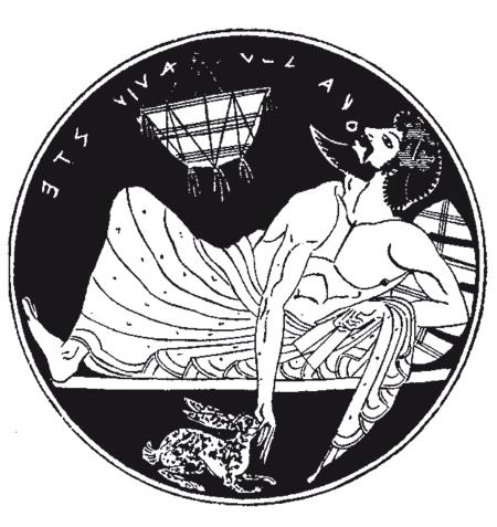 Роспись внутренней поверхности килика из Танагры, Беотия, V в. до н. э. (с 525 по 475 г. до н. э.). Сцена изображает лежащего симпосиаста с кроталой, играющего с кроликом и поющего «O pedon kalliste» (начало стиха Феогнида).