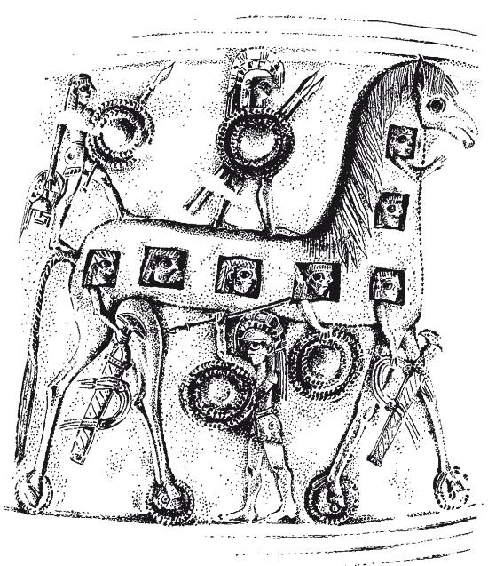 Изображение троянского коня на горлышке большой амфоры с Миконоса. Миф о падении Трои рано нашел отражение в греческом искусстве. В росписи на сосуде, созданном в IV в. до н. э., некоторые завоеватели еще смотрят наружу из оконных проемов, а другие греческие воины уже оставили деревянного коня, поставленногона колеса. (Утраты и повреждения оригинала на рисунке не показаны.)