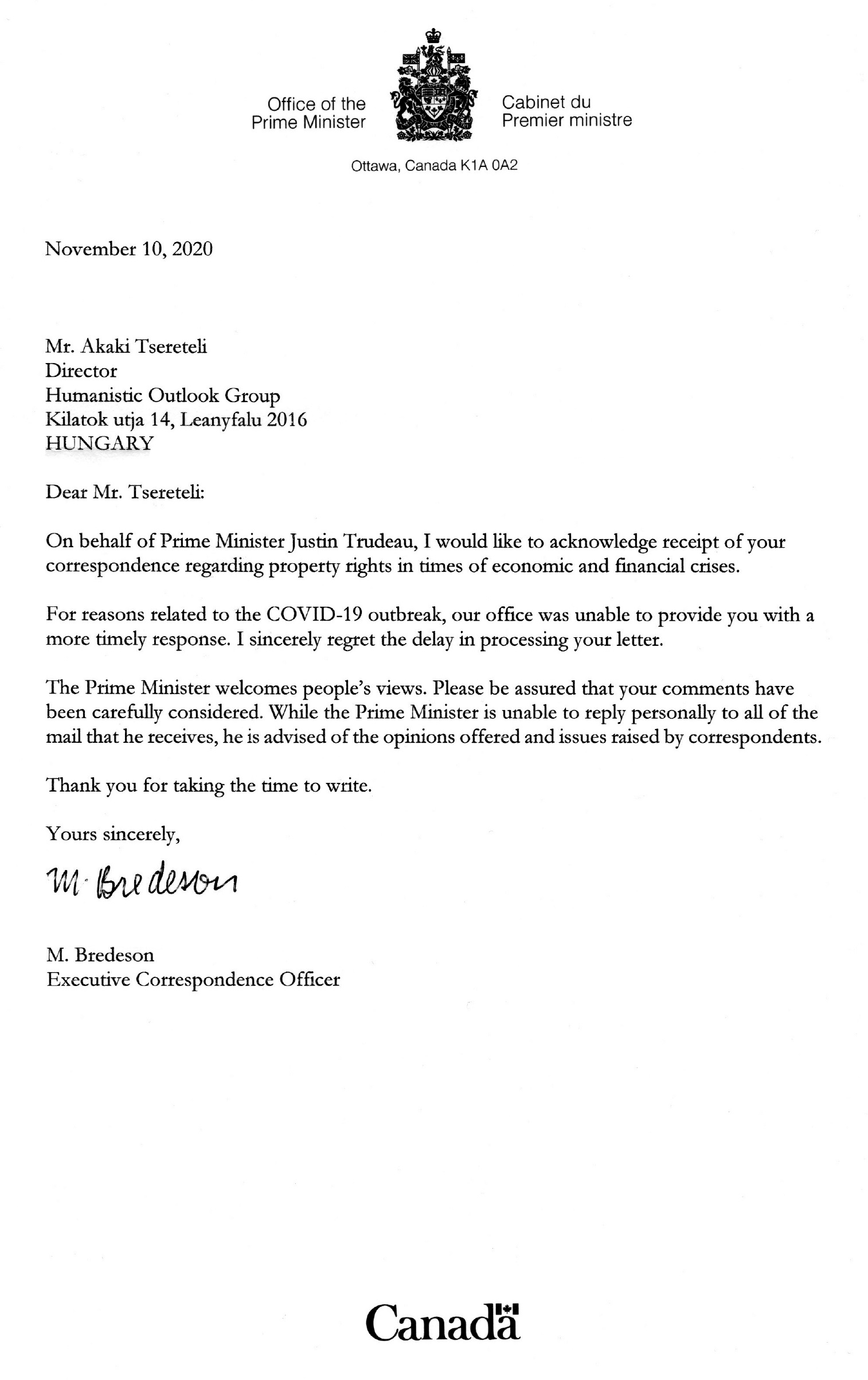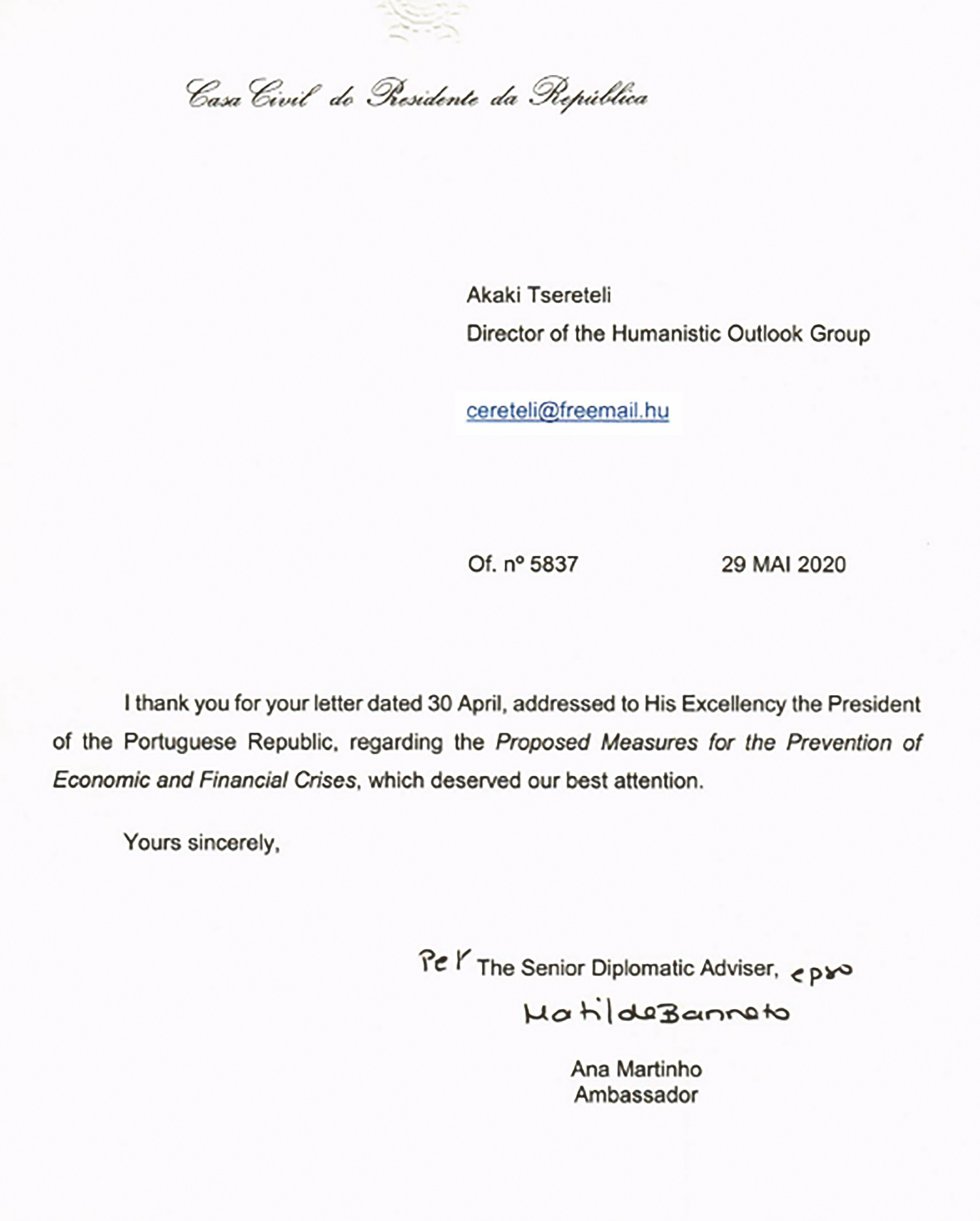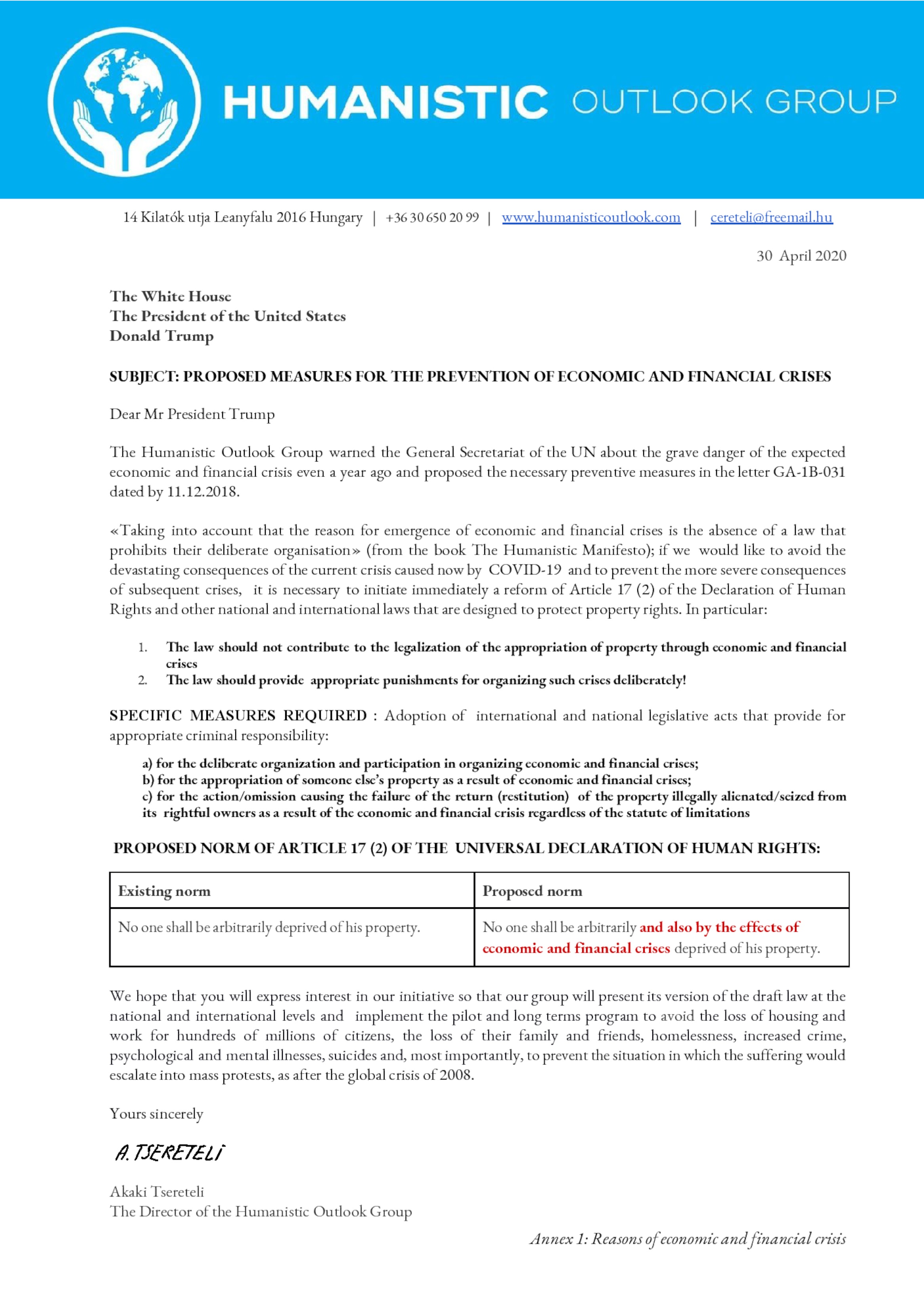 30 апреля 2020 года Организация гуманистической перспективы выступила с новой инициативой, изложенной в письме главам государств – членов “Большой двадцатки” и стран Европейского Союза. Суть нового предложения состояла в необходимости внести изменения в пункт 2 Статьи 17 “Всеобщей декларации прав человека”, что, по мнению ОГП, позволило бы исключить в будущем возможность массовых нарушений прав человека (в том числе – права собственности) вследствие экономических кризисов.