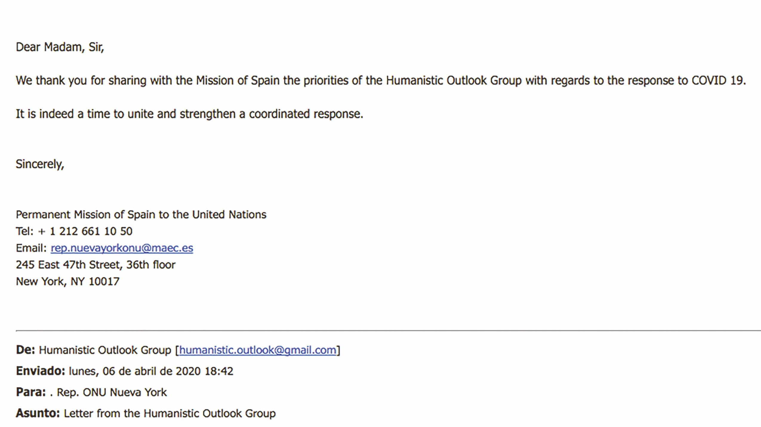 За год до возникновения мирового кризиса, спровоцированного распространением коронавирусной инфекции (COVID-19), Организация гуманистической перспективы в своём письме GA-1B-031 от 11.12.2018. предупредила об этой опасности Генерального секретаря ООН и предложила необходимые меры для её предотвращения.