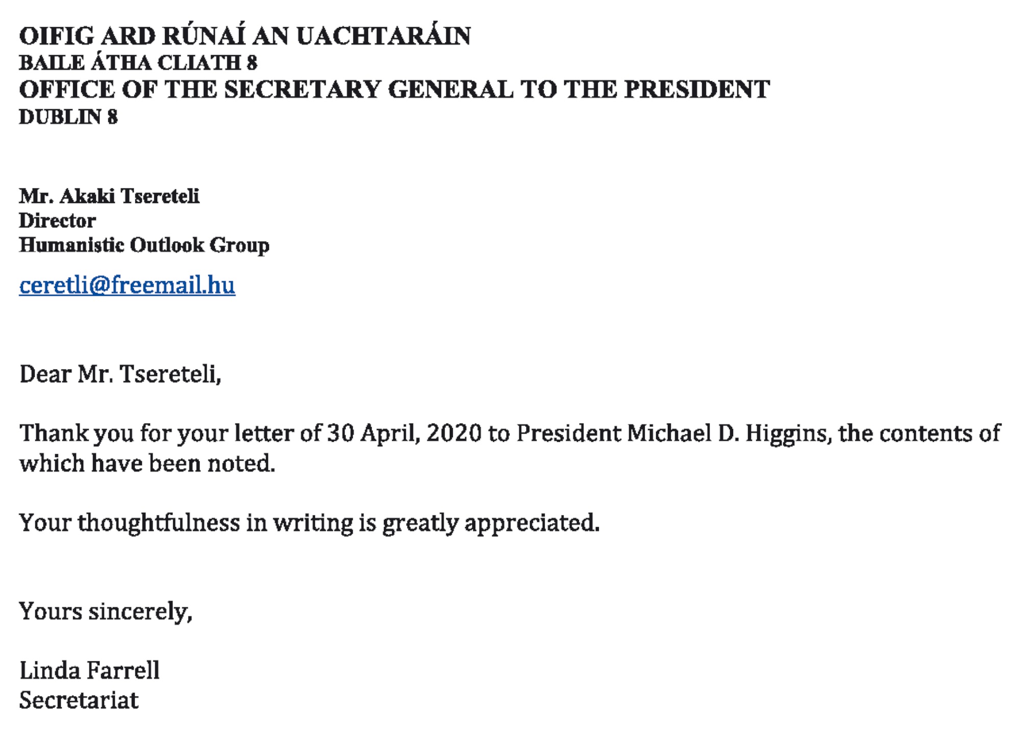 К сожалению, мы вынуждены констатировать, что и это наше письмо не нашло широкой поддержки, не было принято во внимание – и, соответственно, не были проведены мероприятия, которые мы предлагали и которые могли бы предотвратить усугубление и без того тяжёлой ситуации в мире. Ниже приводятся ответы из отдельных стран (Ирландии, Бразилии, Португалии, Канады).