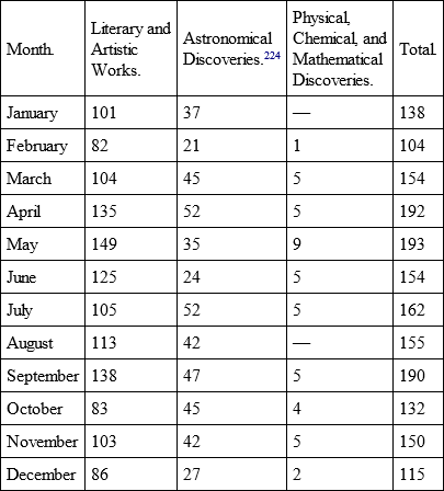 One observes at once that the most favourable month for æsthetic creations is May; then come September and April; the minimum is presented by the months of February, October, and December. The same may be observed partially with astronomical discoveries; but here April and July predominate, while for physical discoveries as well as for æsthetic creations, the months of May, April, and September stand first. Thus the advantage belongs to the months of early heat more than to the months of great heat, as with insanity also; in the same way the months of greatest barometric variation have an advantage over very hot and very cold months.
