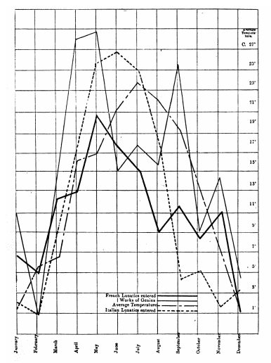 Relation to average monthly temperature to admission of lunatics to asylum, and to production of works of genius.