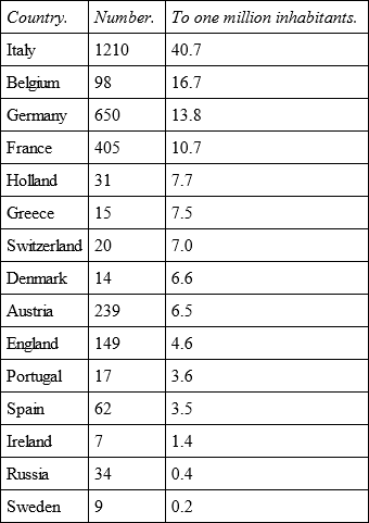 Almost the same relations are observed in regard to sculptors and architects. We see the great centres of civilization and hilly regions in the first rank; Florence especially, then Milan, Venice, Naples, Como, Siena, Verona, Massa, and in the third line Arezzo, Perugia, Vicenza, Bergamo, Macerata, Catania, and Palermo.235