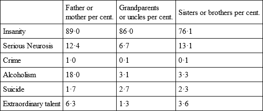 This seems to show that a considerable number of lunatics are descended from men of ability. The number of brothers and sisters of lunatics endowed with ability, surpassing that of suicidal, alcoholistic, or criminal brothers confirms the influence. In twenty-two cases of hereditary insanity Aubonel and Thoré observed two cases of sons of ability.271