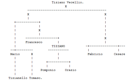 Among musicians may be named the Adams, the Coustons, the Sangallos; among painters, the Van der Weldes, the Coypels, the Van Eycks, the Murillos, the Veroneses, the Bellinis, the Caraccis, the Correggios, the Mieris, the Bassanos, the Tintorettos, the Caliaris, the Vanloos, the Teniers, the Vernets, and especially the Titians who produced a race of painters, as shown in the following genealogy taken from Ribot’s excellent book: —