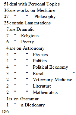 As to the subjects chosen, an examination of 186 insane books in my collection gives the following result: