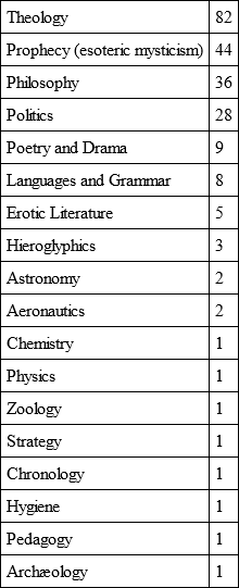 While poetry prevails among the insane, theology and prophecy predominate in the mattoids, and so on in diminishing proportions for the more abstract, uncertain and incomplete sciences, as we see by the scarcity of the naturalists and mathematicians. It is well to note the small number of atheists – three only, amid such a swarm of theologians and philosophers (162). Spiritualism, on the other hand, is so much in favour, that Philomneste gave up the task of cataloguing the works which treated of it.