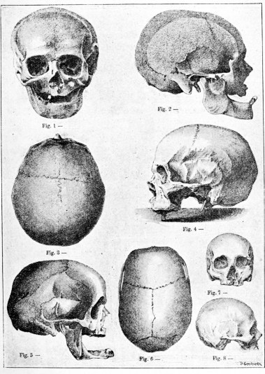 In Volta’s skull24 I have noted several characters which anthropologists consider to belong to the lower races, such as prominence of the styloid apophyses, simplicity of the coronal suture, traces of the median frontal suture, obtuse facial angle (73°), but especially the remarkable cranial sclerosis, which at places attains a thickness of 16 millemetres; hence the great weight of the skull (753 grammes).