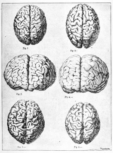 “The comparative study of these brains,” writes Hervé,33 “shows that individual variations of the cerebral convolutions are more numerous and more marked in men of genius than in others. This is especially the case in regard to the third frontal convolution which is not only more variable in men of genius, but also more complex, especially on one side, while in ordinary persons it is very simple both on the left and on the right. Without doubt the individual arrangements which may be presented by the brains of men of remarkable intelligence may also be found in ordinary brains, but only in rare exceptions.”