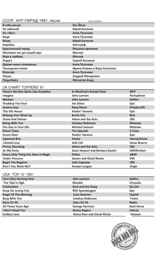 Завершая рок-обзор 1981 года приведу довольно бессвязную характеристику советскому (русскому) року как самостоятельному музыкальному жанру, которую дает в это время известный официальный критик в прессе: «Русский рок – это стиль музыки, в котором присутствует философское, а порой бессмысленное, но веселое представление текстов песен, мелодичная музыка с использованием электрогитар».