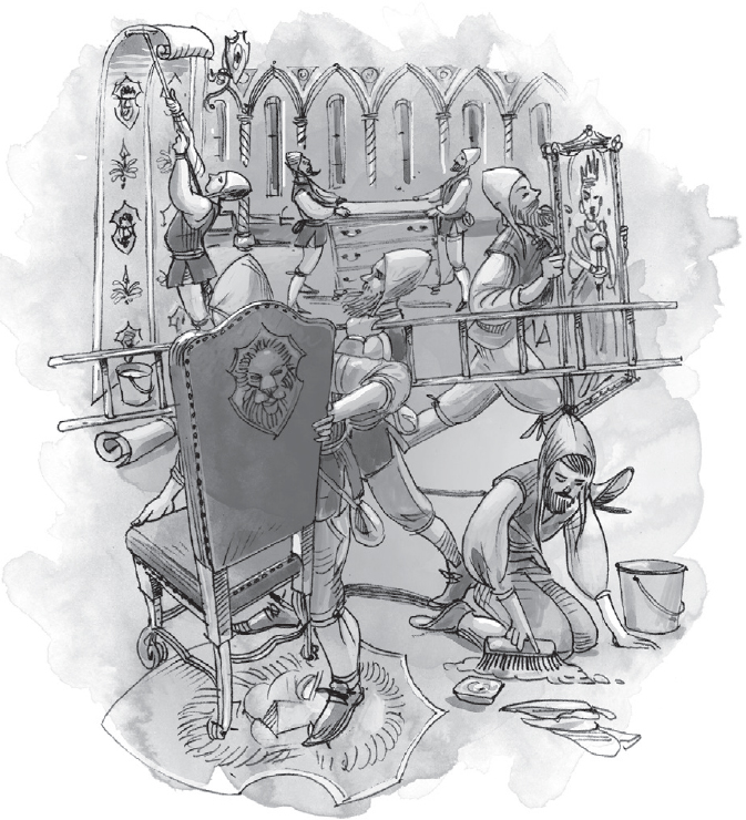 Nor did they answer Sophie’s question. But as Sophie passed sitting rooms, bedchambers, a library, and solarium, each being renovated with Lion crests and carvings and emblems, it became clear that Camelot did have money. Lots of it. Where had the gold come from? And who were those three sisters acting like they owned the place? And how was this happening so soon? Rhian had barely become king and suddenly, the whole castle was being remade in his image? It didn’t make any sense. Sophie saw more men shuffle by, carrying a giant portrait of Rhian in his crown and asking guards for directions to the “Hall of Kings” where they were supposed to hang it. One thing was for sure, Sophie thought, watching them veer towards the White Tower: all of this had to have been planned by the king long before today. . . .