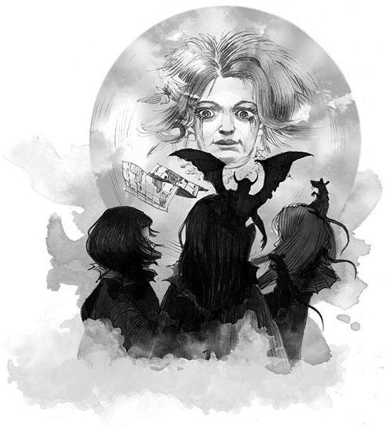 Evil Hall’s doors flung open once more and Clarissa Dovey marched in, silver hair fraying from her high bun, beetle wings flapping on her green teacher’s gown.