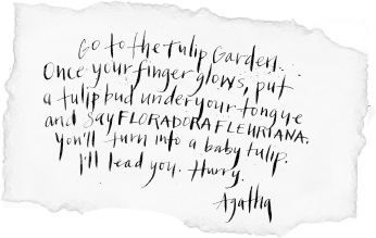 Panting, grunting, Sophie clawed herself through the last patch of willows, dirt turning to loamy petals beneath her. Exultant, she collapsed into big, blue flowers and inhaled their scent, reviving instantly. She shoved a tulip bud in her mouth, grabbed Agatha’s note from her pocket, finger glowing pink—