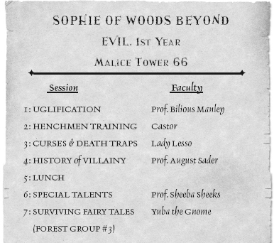 Sophie looked up, dumbstruck. “See you in class, Witch of Woods Beyond,” the hag croaked. Before Sophie could respond, an ogre dumped a ribbon-tied stack of books in her hands.