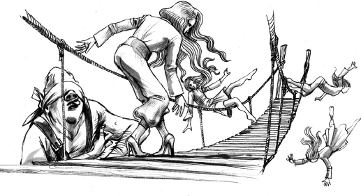 As all the girls lined up at the bridge, Agatha questioned how 120 girls could each take a turn by the time class ended—and got her answer when Yara took her first step and was flung squawking into the trees before she took another. Girl after girl barely made it past the first plank, hurled left and right by the hopping Ingertroll, smacking her gums and wagging her bottom.