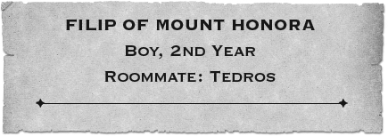 But Castor was smirking at the stranger, amused. “Welcome to the School for Boys, Filip.”
