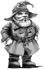 They looked down to find a four-foot gnome with wrinkly brown skin, a belted green coat, and a pointy orange hat frowning from a hole in the ground.
