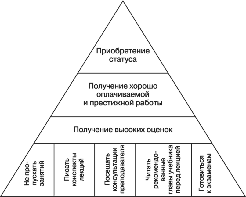 Рис. 2.1. Многоуровневость целей. Основополагающим мотивом стремления человека к приобретению статуса может быть цель получить хорошую работу. Получать высокие оценки может быть подчиненной целью этой цели, которая, в свою очередь, может иметь несколько своих подчиненных целей, таких как желание посещать занятия, работать в офисе в положенные часы и т. д.