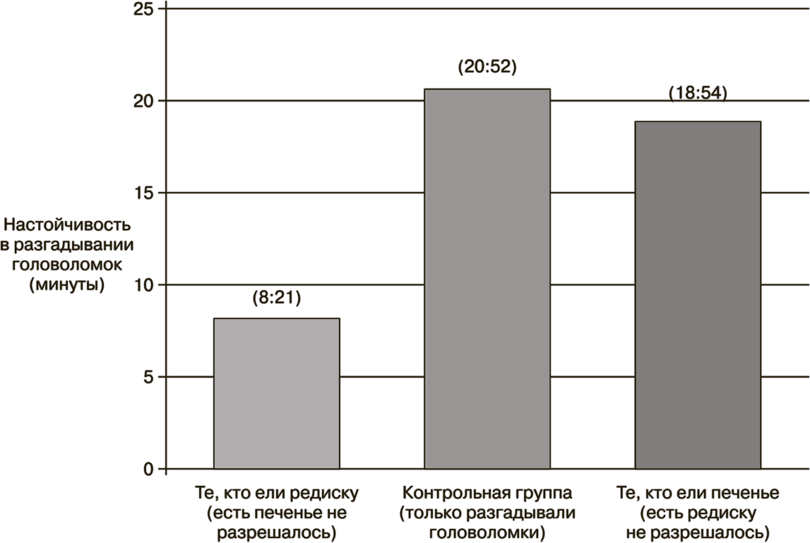 Рассмотрим эксперимент, проведенный для проверки этой гипотезы (Baumeister, Bratslavsky, Muraven & Tice, 1998). Голодные студенты, полагавшие, что они участвуют в исследовании восприятия вкуса, так как их просили не есть минимум три часа до начала эксперимента, сидели в комнате, наполненной ароматом свежеиспеченного шоколадного печенья. На столе перед каждым студентом находились горка шоколадного печенья в окружении шоколадных конфет и миска с редиской. Участники должны были выполнять одну из двух инструкций: одни должны были съесть минимум две-три редиски и ни одного печенья (или конфеты) в течение следующих пяти минут, другие – съесть в течение тех же пяти минут два-три печенья (или конфеты) и ни одной редиски. Дав эти указания, экспериментатор покидала комнату. Когда она возвращалась, то просила участников решить несколько трудных головоломок для другого исследования, никак не связанного с предыдущим, чтобы дождаться, пока их «сенсорная память» о съеденных продуктах ослабнет. Предлагавшиеся головоломки не имели решения, но участники об этом не знали. Принимая во внимание гипотезу о том, что сила воли является ограниченным ресурсом, пропадающим на какое-то время после его использования, кто, по вашему мнению, прекращал решать головоломки раньше: те, кто должны были есть редиску и не есть печенья, те, кто должны были есть печенье и не есть редиску, или члены третьей (контрольной) группы, которым не предлагали никакой еды до начала решения головоломок?