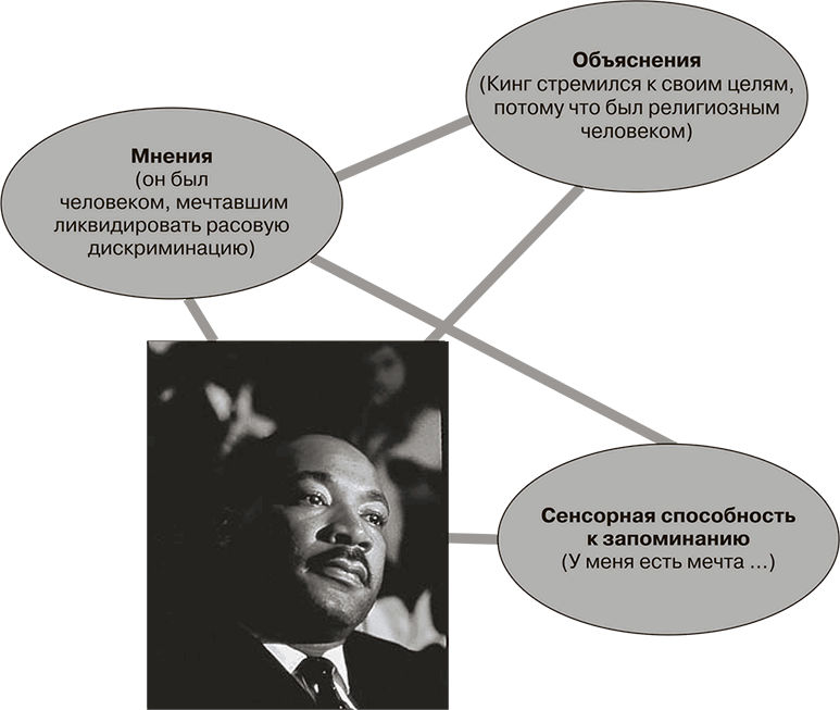Рис. 2.3. Ментальная репрезентация Мартина Лютера Кинга. Ментальные (умственные) репрезентации содержат и организуют имеющуюся у нас информацию о людях, предметах и событиях. Как показано на этом рисунке, гипотетическая ментальная репрезентация Мартина Лютера Кинга может содержать разного рода информацию.