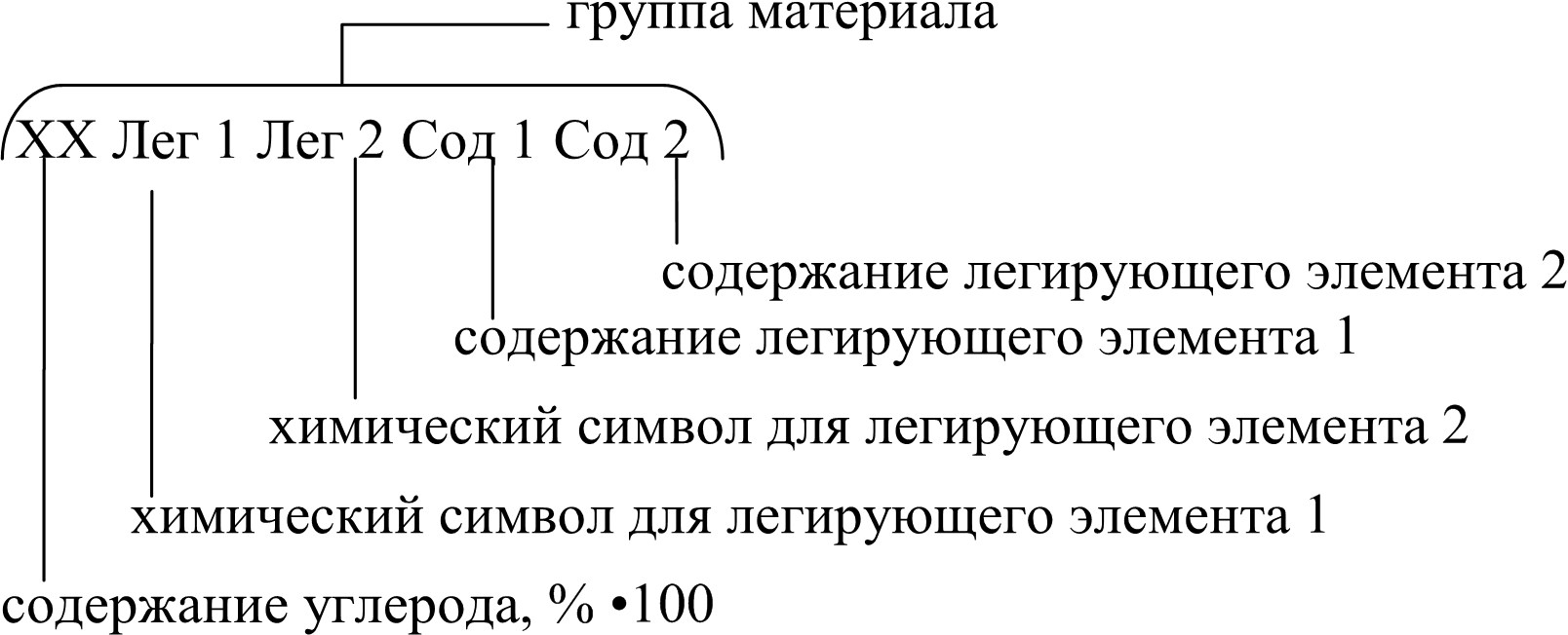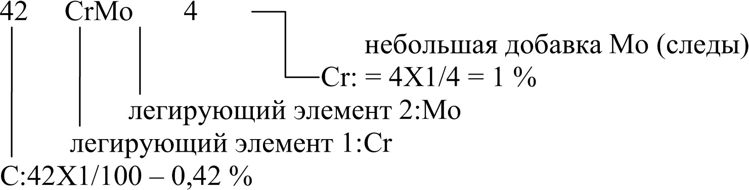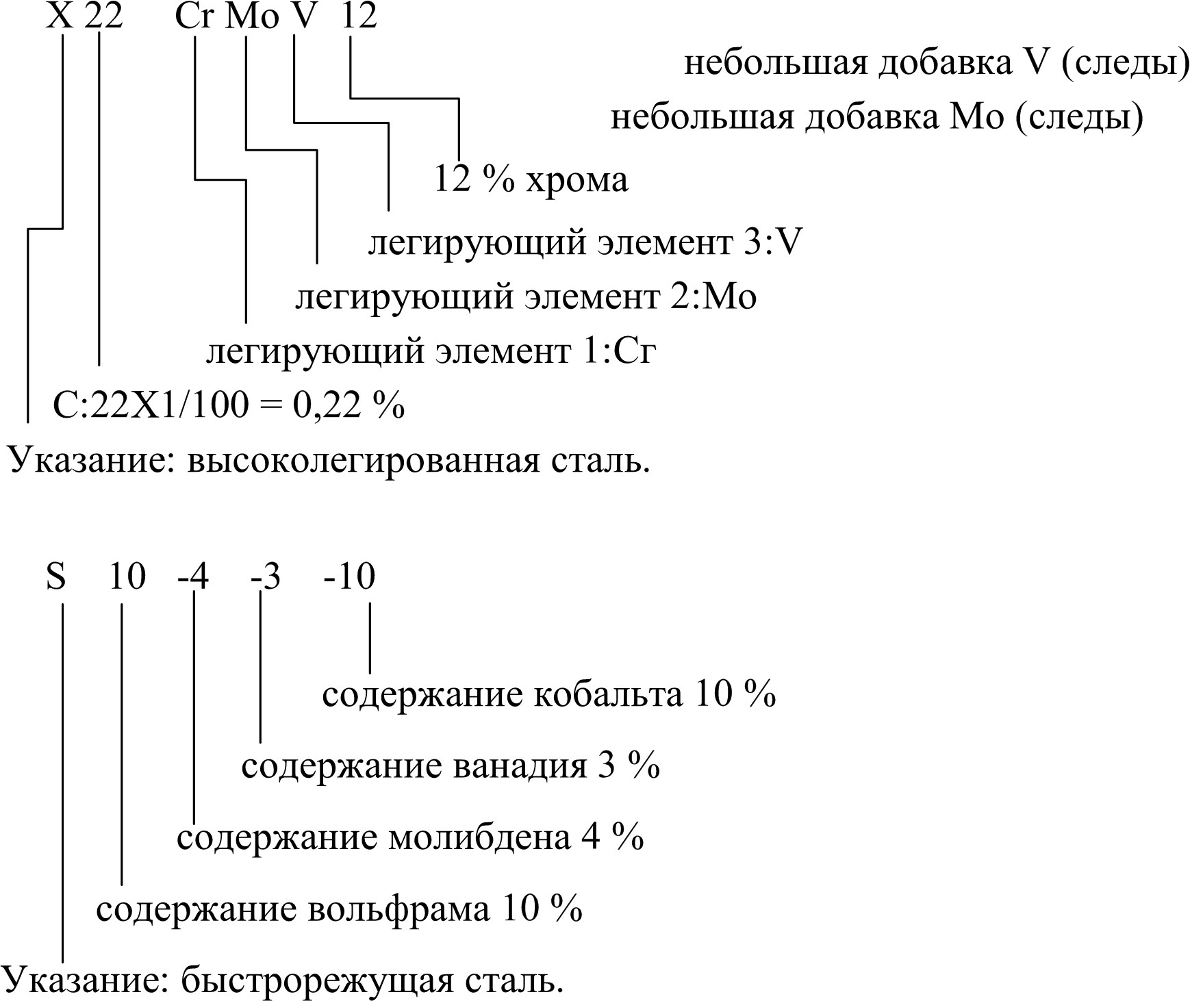 Химический символ для углерода отпадает. Химические символы приведенных легирующих элементов расположены в последовательности их содержания (при одинаковом содержании в алфавитном порядке). Для обозначения стали приведены только элементы и нумерация, которые необходимы для определенной характеристики и отличия от других видов стали. Соответствующая последующая цифра о содержании легирующих элементов относится к соответствующему легирующему элементу. Если отсутствует данное число (цифра), то содержание легирующего элемента незначительно. Для определения содержания легирующих элементов в процентах (по массе) цифра умножается на определенный коэффициент: