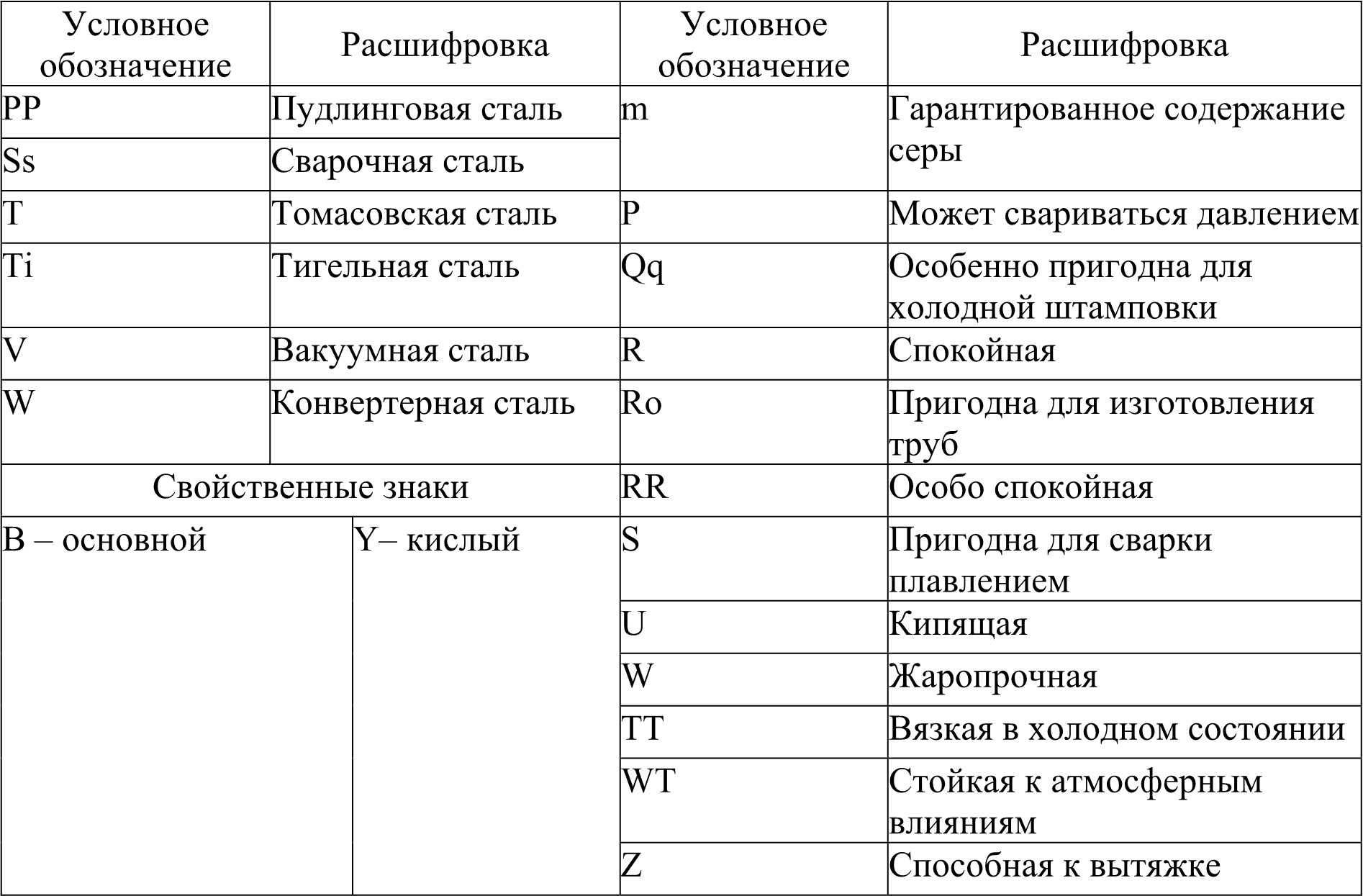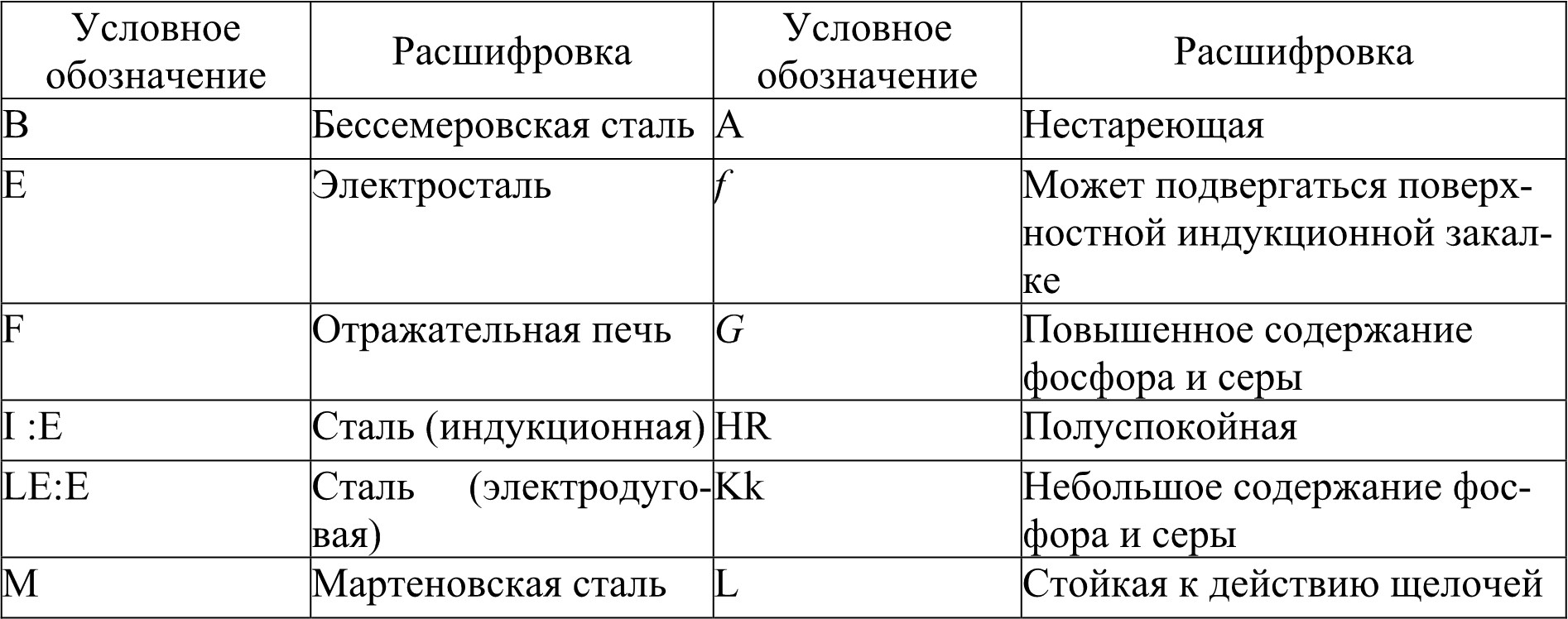 Производственная часть может содержать данные о видах плавки, а также возникающих при этом свойствах. При современном производстве стали практически учитывается только еще способ продувки кислородом и производство в электропечи (преимущественно в электродуговой печи). Сталь, изготовленная продувкой кислородом сверху (LD-способ) и сквозной продувкой кислородом (ОВМ-способ), соответствует SM-качеству с обозначением М. Особые обозначения стали применяются еще только для электростали (Е) и стали, выплавленной в вакуумной печи (V) (табл. 1). Ради полноты упомянем дополнительные обозначения, содержащиеся еще в стандарте, хотя они частично очень устарели, например пудлинговая и сварочная стали, которые практически не применяются с прошлого века.