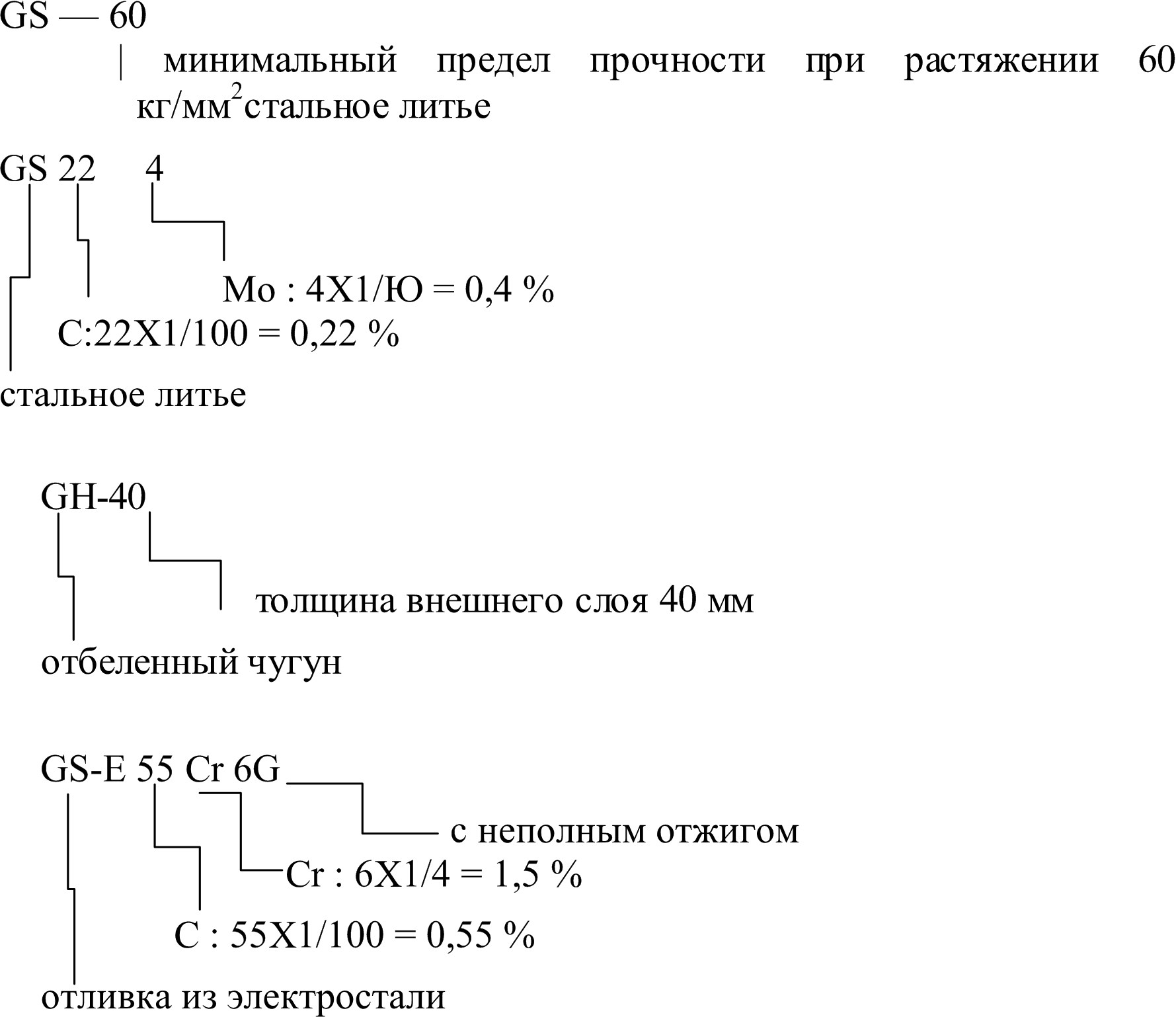 У отбеленного литья цифры от 0 до 50 за знаком литья GH обозначают толщину твердого внешнего слоя в миллиметрах, а цифры от 51 до 90 склероскопическую твердость по Шору. У жаропрочного стального литья за знаком литья следует указание состава как у стали.