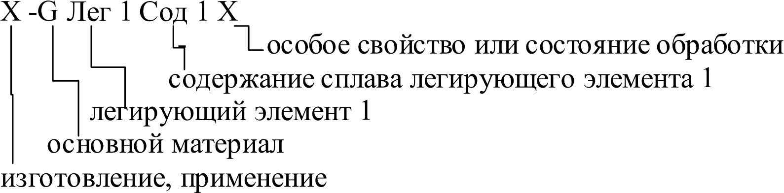 У большинства металлических сплавов химический символ основного металла чаще всего не имеет указания на процентное содержание, за ним следуют химические символы легирующих добавок. Составные части сплава указываются с полным процентным содержанием. У деформируемых сплавов отпадают буквенные обозначения для изготовления и применения.