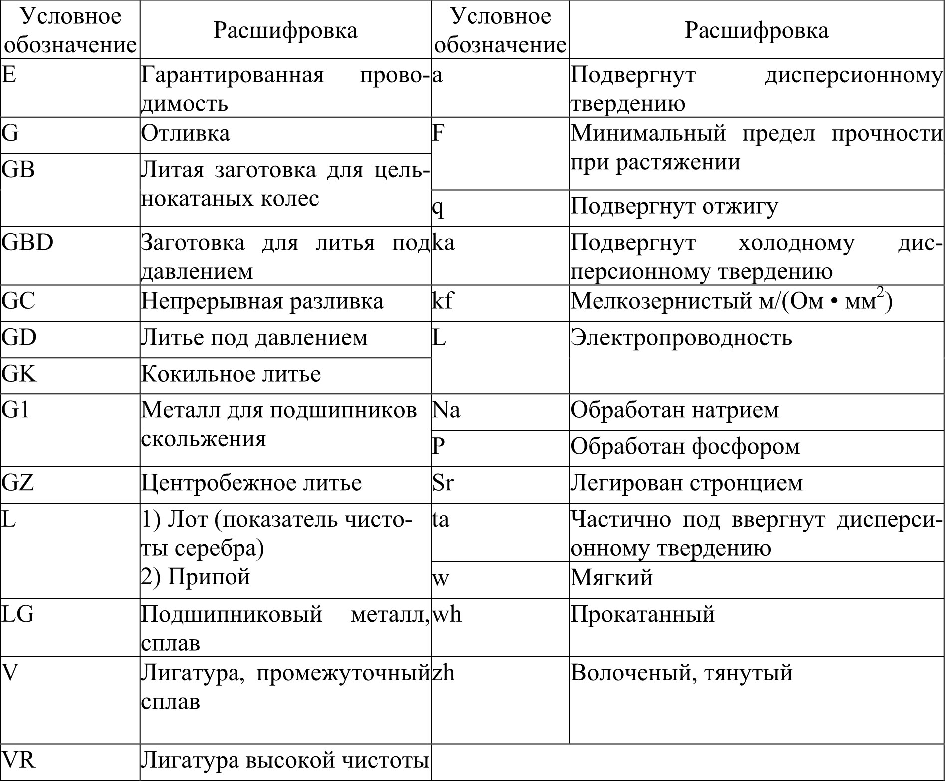 Соответственно степени чистоты у цветных металлов маркировка может происходить в первичном металле (буква Н), чистом металле (нет маркировки) и в самом чистом металле (буква R). Маркировочные буквы иногда ставятся впереди (Mg, Ni), иногда позади (А1).