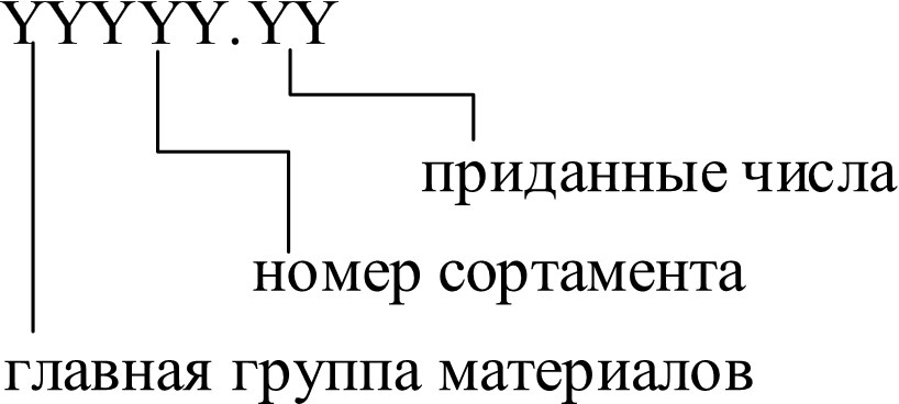 Номер сортамента. У сортаментного номера речь идет о четырехзначном числе, у которого первые две цифры при главной группе материалов от 0 до 1 поясняют материал определенных сортовых классов. Последние две цифры являются чистыми числовыми номерами. У цветных сплавов деление происходит по основным металлам.