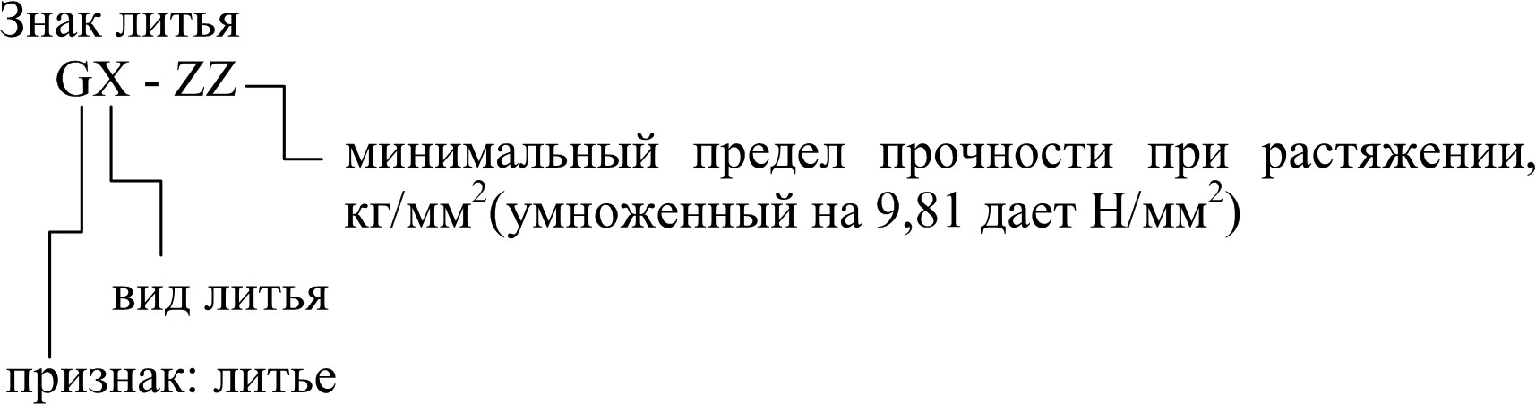 Обозначение материалов из чугунного литья. У материалов из чугунного литья характеристика осуществляется знаком литья G, который, как правило, связан с данными о виде литья. Простой знак G применяется только в особых случаях (например, при магнитных сплавах, высоколегированных материалах и т. д.). Все остальные данные нанесены на литейный знак с помощью черточки.
