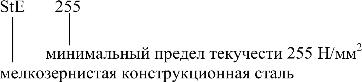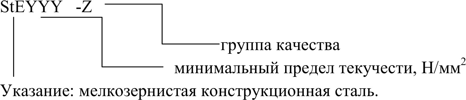 У мелкозернистых сталей подразделение происходит по минимальному пределу текучести. Характеристика мелкозернистых сталей происходит путем вставки буквы "Е" после сокращения St.