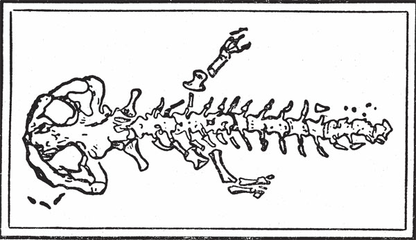 Когда мы отпрепарировали скелеты убитых животных, то пришли к прелюбопытнейшему выводу: скелет данных саламандр практически полностью совпадает с отпечатком скелета ископаемой саламандры, обнаруженным на каменной плите в энингенских каменоломнях д-ром Иоганном Якобом Шейхцером и изображенным им в труде «Homo diluvii testis»[10], изданном в 1726 году. Напомним здесь менее осведомленным читателям, что упомянутый д-р Шейхцер считал этот отпечаток останками допотопного человека.