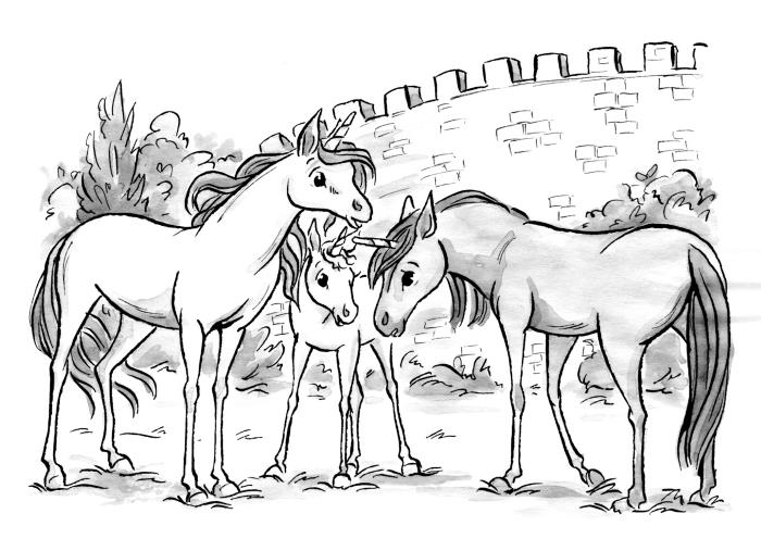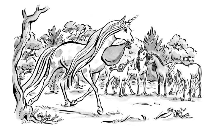 Ивка рысцой бежала по траве к Волшебным Полям. Она не хотела опоздать на урок. На голубом небе не было ни одного облачка, и солнечные лучи поблёскивали на её золотом роге. Чуть впереди она заметила одну из своих лучших подруг, Сапфир.