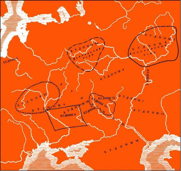 Взять, к примеру, карту составленную Б. А. Рыбаковым с обозначенными на ней данными расположения племени Будинов по Геродоту по вариантам трактовок некоторых авторов. (см. на сл. стр.)