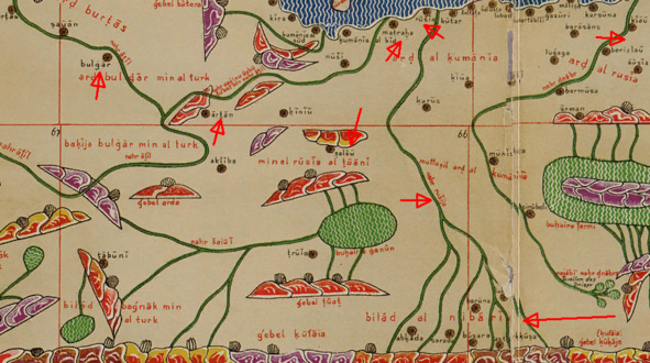 Обратите внимание на объекты карты обозначенные стрелками. Слева просматривается Волга (Итиль) с ее двумя рукавами один из которых впадает в Каспий, второй в Черное море. При этом, истоки Итиля идут с востока, скорее, таковым считалась современная р. Белая, современные Волга и Ока не обозначены.