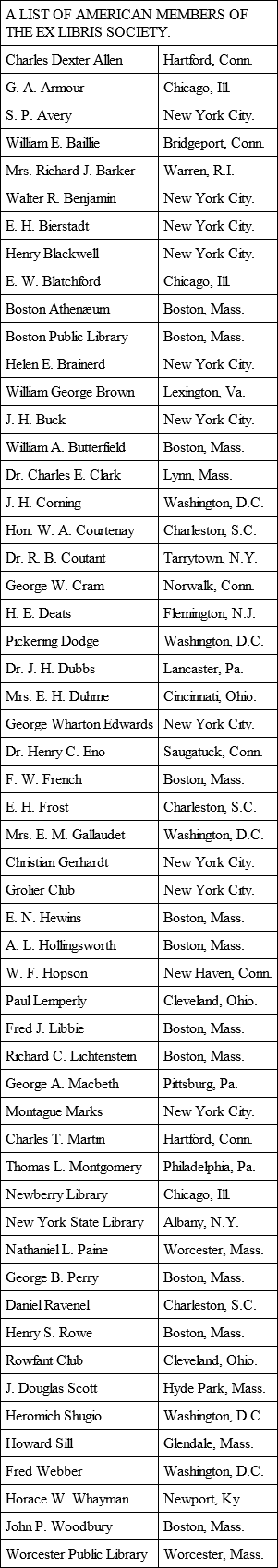 The larger part of our collectors are members of the Ex Libris Society, of England, while many have also joined the societies in France and Germany. No American Society has as yet been seriously proposed.