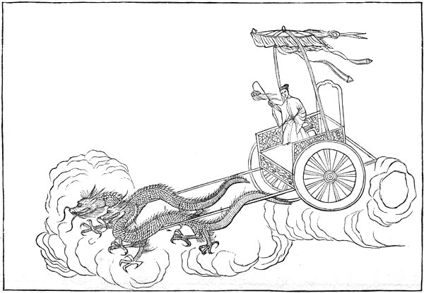 The annexed wood-cuts (Figs. 56, 57) of Ping I (Icy exterminator), and the Emperor K’i (B.C. 2197), each in cars, driving two dragons, are interesting in connection with the later fable of Medea and Triptolemus. The two stories were probably derived from a common source; the Chinese version, however, being much the older of the two.
