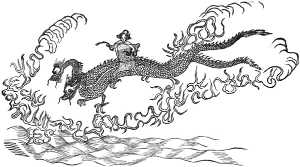 The better printed copies of this work are illustrated with a very truculent-looking dragon with outspread wings. A stone delineation of a dragon with wings forms the ornamentation of the bridge at Nincheang Foo. In the interior of China, it was observed by Mr. Cooper, and is given in his Travels of a Pioneer of Commerce. These are the only cases in China in which I have come across illustrations of dragons with genuine wings. As a rule, the dragon appears to be represented as having the power of translating itself without mechanical agency, sailing among the clouds, or rising from the sea at pleasure.