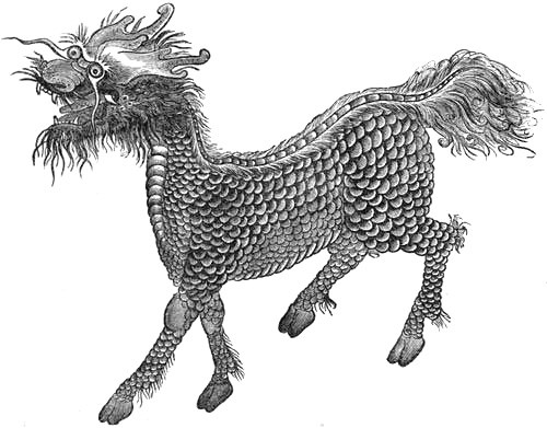 The ’Rh Ya, in the original text, defines the Lin as having a Kiun’s body (the Kiun is a kind of muntjack or deer), an ox’s tail, and one horn. The commentary states that the tip of the horn is fleshy, and that the King Yang chapter of the “Spring and Autumn Annals” of Confucius defines it as a horned Kiun.