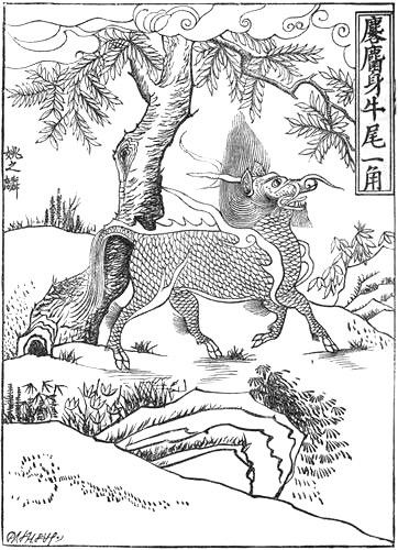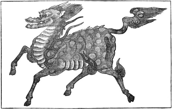 The “Shi Ki,” in the book Fung Shen, says that during the worship at the solstices at Yung, there was captured a one-horned beast like a Piao, and that the local authorities assert that as His Majesty was making reverential invocations on the country altar to the Supreme Being, he was recompensed for the sacrifice by a beast which was a unicorn.