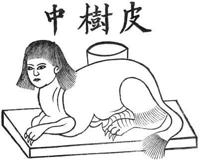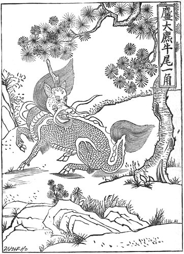 The Ki-Rin, a Japanese version of the Ki-Lin, is simply borrowed from Chinese sources. It is figured in the illustrated edition of the great Japanese Encyclopædia Kasira gaki zou vo Sin mou dzu wi tai sei,301 and represented, as in the Chinese drawings, as covered with scales; but it must be noted that nothing in any of the texts of either country warrants this furniture of the body.302