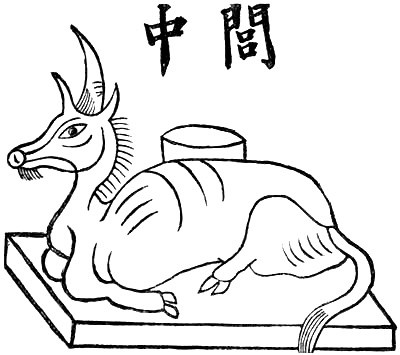 A synonym for it was the Chiai Tung. It states that, according to the Si Yang Y Shu, a one-horned spiritual lamb was born in the Ping Shen district, and in the twenty-first year of Kai Yuen. The horn was fleshy, and the top of the head covered with white hair. The second chapter on the same subject says that, in ancient times, if parties were at law, the judge brought this animal out, and it would gore at the guilty one.