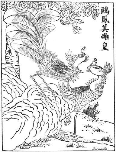 According to the Annals of the Bamboo Books phœnixes, male and female, arrived in the autumn, in the seventh month, in the fiftieth year of the reign of Hwang Ti (B.C. 2647), and the commentary states that some of them abode in the Emperor’s eastern garden; some built their nests about the corniced galleries (of the palaces), and some sung in the courtyard, the females gambolling to the notes of the males.