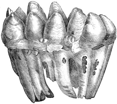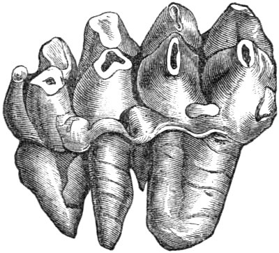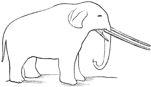 The Mastodon. – The generic title Mastodon has been applied to a number of species allied to the elephants, but distinguished from them by a peculiar structure of the molar teeth; these are rectangular, and in their upper surfaces exhibit a number of great conical tuberosities with rounded points disposed in pairs, to the number of four or five, according to the species; whereas in the elephants they are broad and uniform, and regularly marked with furrows of large curvature. The mastodons, in addition to large tusks in the premaxillæ, like those of the elephant, had also in most instances, a pair of shorter ones in the mandible.