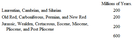 Sir Charles Lyell and Professor Haughton respectively estimated the expiration of time from the commencement of the Cambrian at two hundred and forty and two hundred millions of years, basing their calculations on the rate of modification of the species of mollusca, in the one case, and on the rate of formation of rocks and their maximum thickness, in the other.